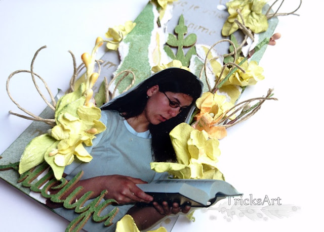 I wanted to close that feeling on my tag. That's why I choosed the picture of my sister, who is reading a reflective text just before the Easter breakfast. As a background I've used a grey paper from Here and Now collection, which fits well to the picture. then I added some writing motive by using stencil and ink. Thet I put some color by using small pieces of papers from the Spring Sky collection, chipboards on which I put green ink and clear-gold wax paste and flowers of course. I added also some string to the flower composition. And in the end I put a caption Alleluja.